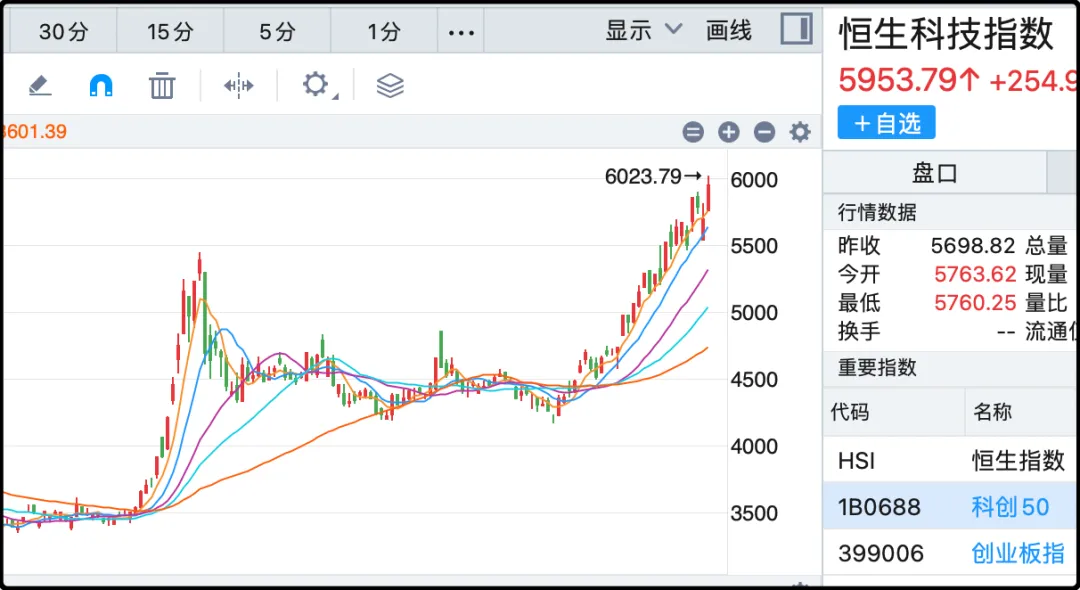今天行情好呢,恒生科技指数再度大涨4.47%,收于5953点,其实盘中高点已经到过6023,所以站上6000点也就是捅破窗户纸而已。南下资金今天净买入104亿,继续为中概股的 ...